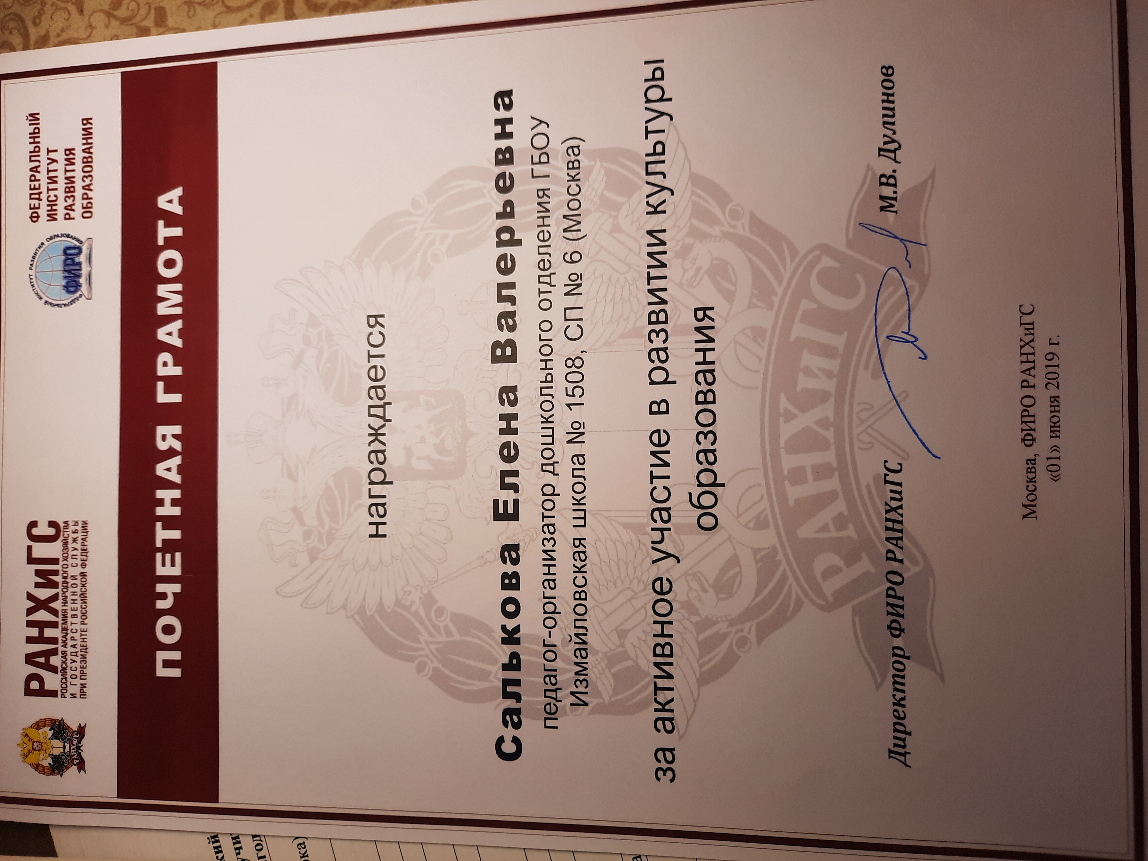 Почетная грамота Федерального института развития образования РАНХи ГС за активное участие в развитии культуры образования.